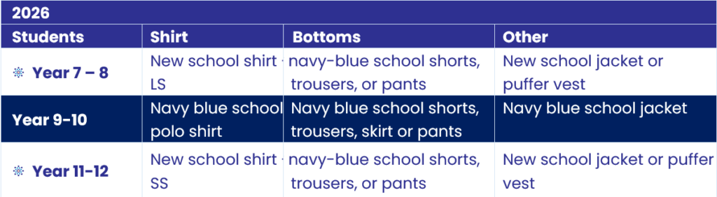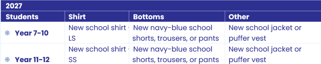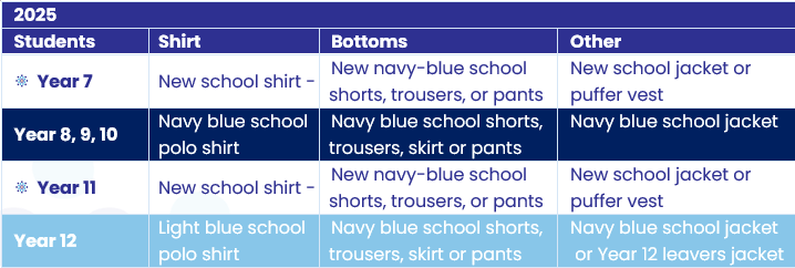 All year 7 students will be required to wear the new school uniform from the commencement of the school year. Years 8-12 may continue to wear their current uniforms and are not obligated to acquire a new uniform for the year 2026; However, families will have the option to purchase new uniforms if they choose to do so.